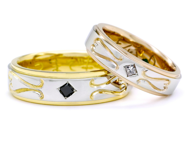 2色の金属を上手に使った、コンビネーションに彫りを施した結婚指輪。