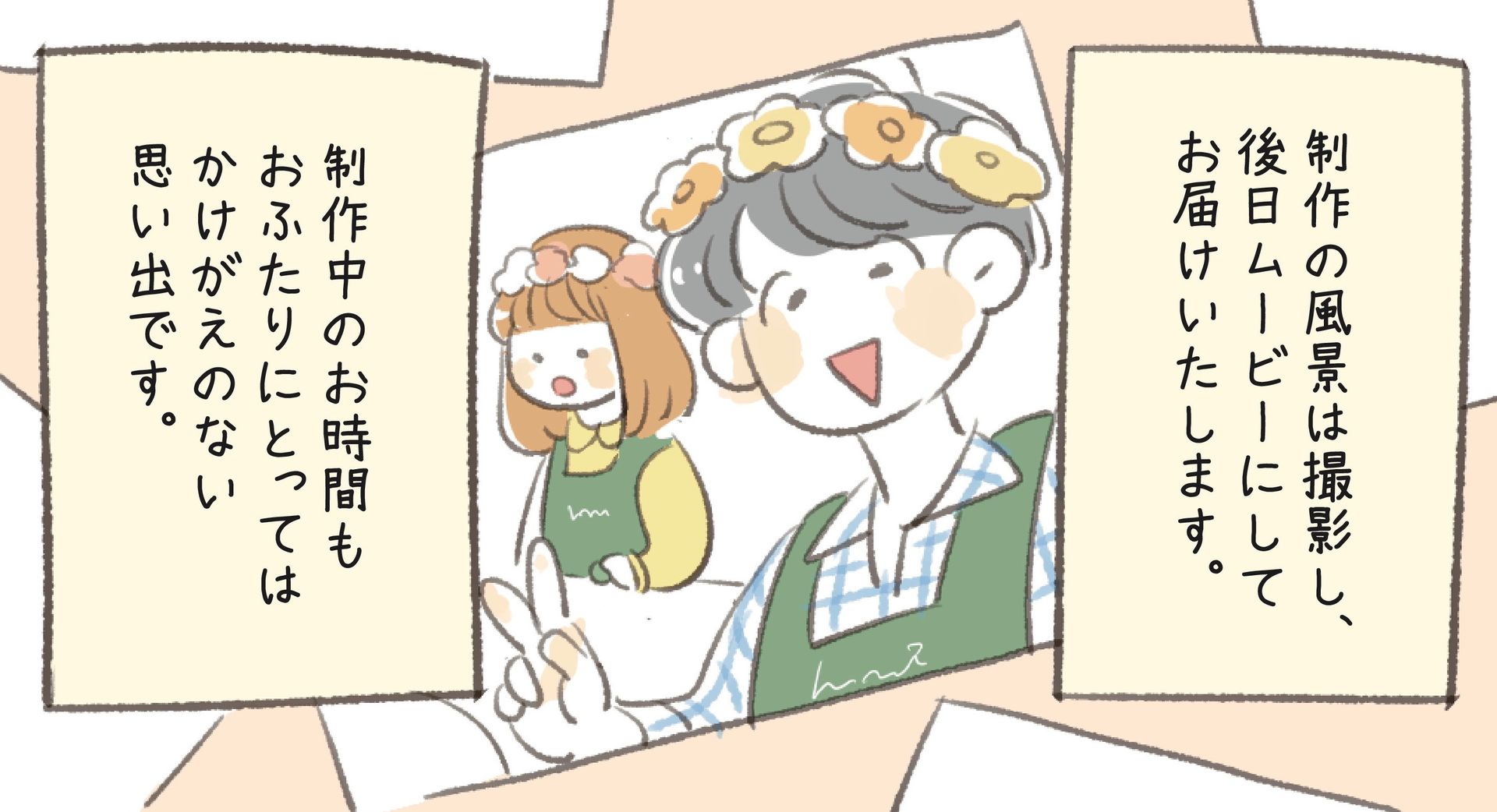 おふたりの制作風景を、結婚式でも使えるウエディングムービーにしてプレンゼントいたします♪ 「自分たちの手で作ったときの想い出を、形にして残したい」 「みんなに作ったことをお披露目したい」 「子供に見せたい」 などのお声をいただき、スタッフ一同心を込めて撮影しております! 撮影するだけでなく、その素材を編集してお渡ししております。もちろんデータの入ったSDカード付きです☆ 特別な時間をいつでも思い出せますように♪