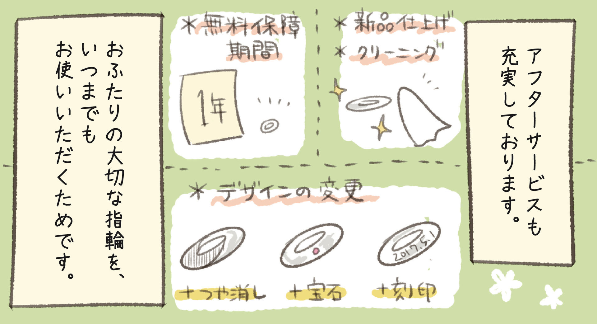 指輪1組1組に証明書&保証書をお付けしております。指輪はもちろん永久保証です! そして一年間の無料保証期間を付きです♪ 自社工房がありますので、新品仕上げやサイズ直し、指輪のメンテナンスはお任せください。 配送での対応もしておりますので、お気軽にご利用ください。