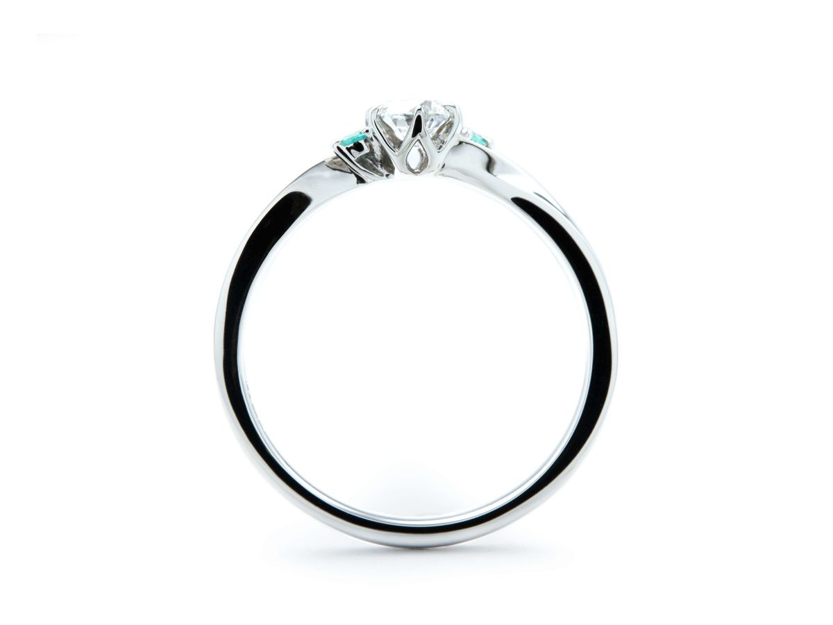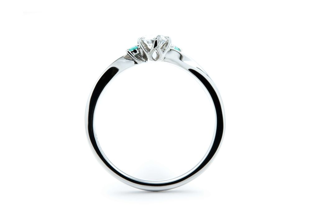 センターにはクリアなダイヤモンドをセットし、その両側に鮮やかなブルーが美しいパライバトルマリンを添えたダブルサイドメレのデザインに仕上げました。指元に広がる鮮やかな色彩が、華やかさと特別感を引き立てます。