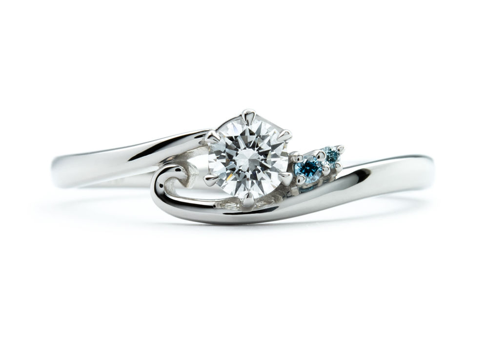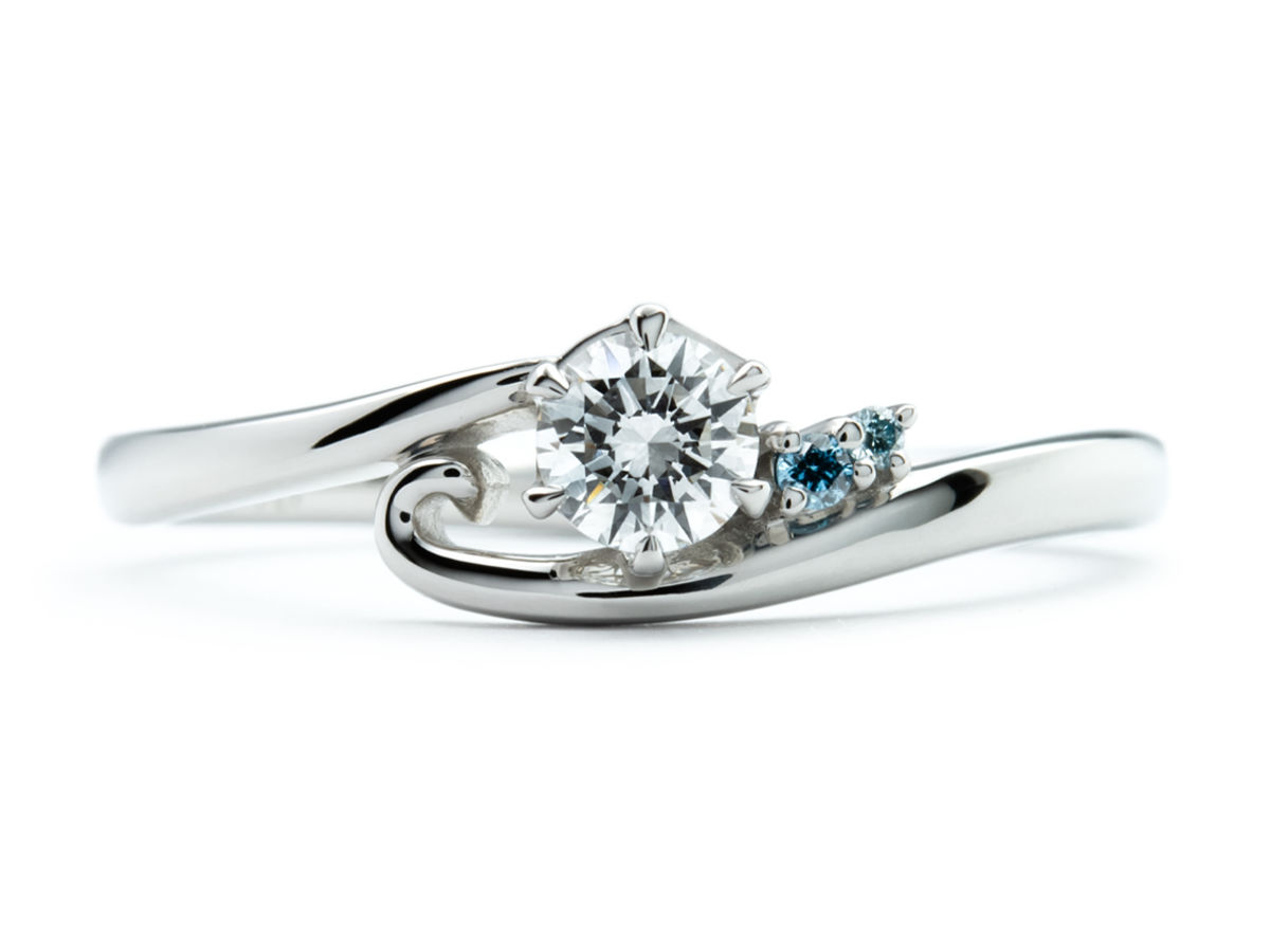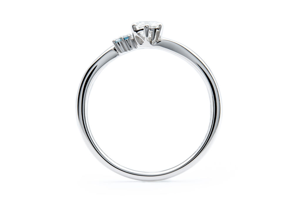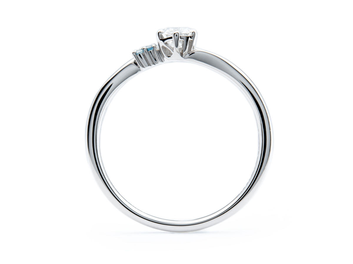 全体のフォルムはV字なのですが、右側のアームが優しく巻き込むようにカーブし、右側にディープブルーダイヤモンドとアイスブルーダイヤモンドを添えております。