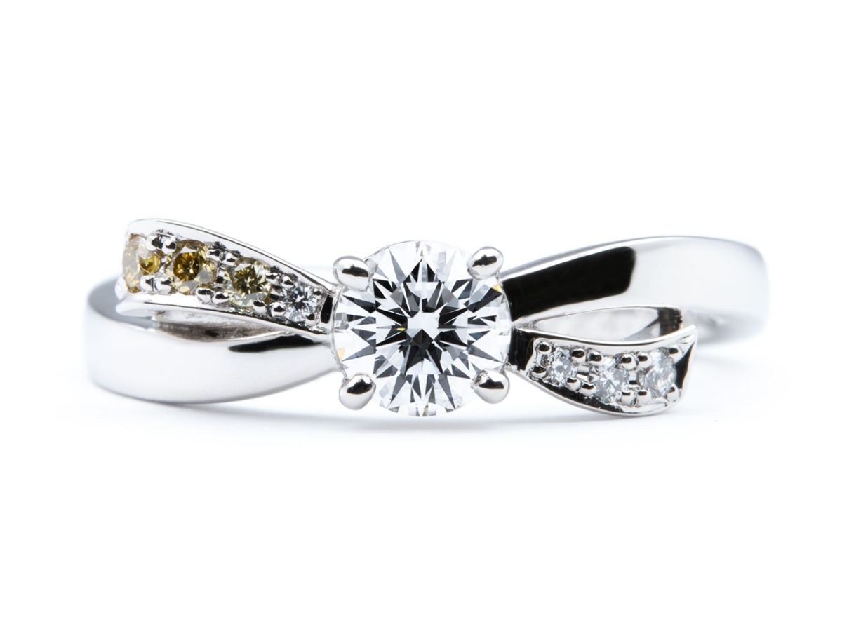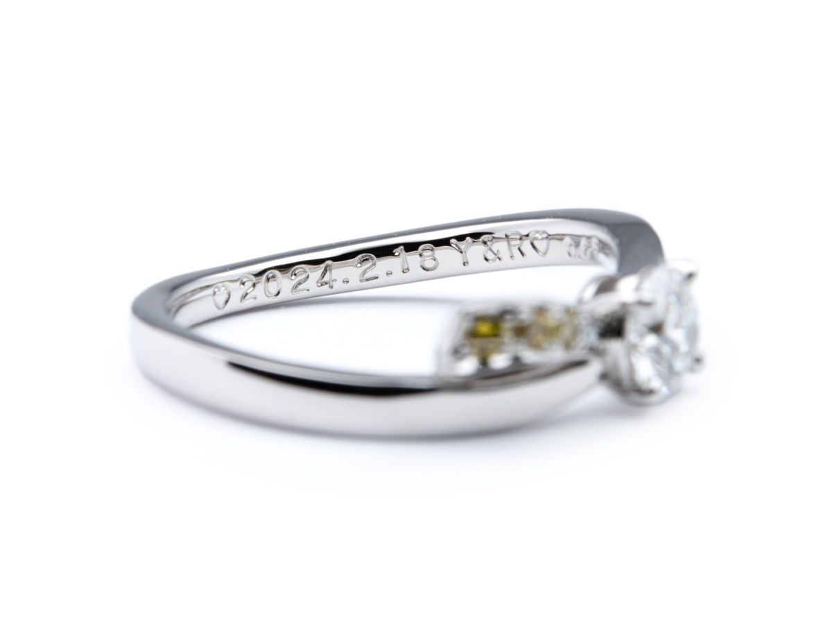 ご婚約指輪は、左側のメレダイヤモンドがホワイトからイエローへとグラデーションになっており、さりげない黄色の輝きが華やかさを添えています。