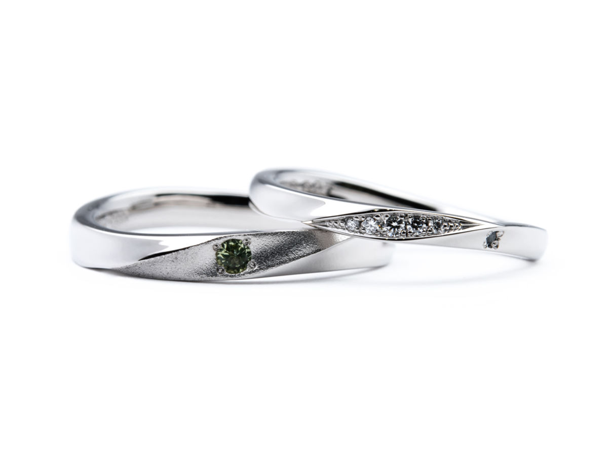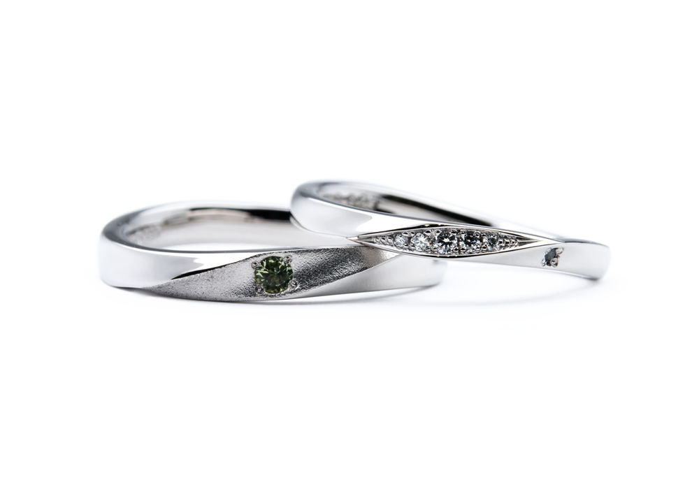 ご新郎様は中央にホーニング加工を施し落ち着いた雰囲気に、ご新婦様は可憐に輝くダイヤモンドを彫り留めして上品に仕上げられました。