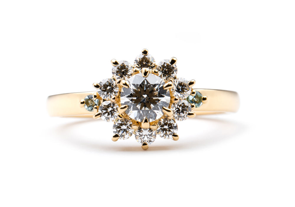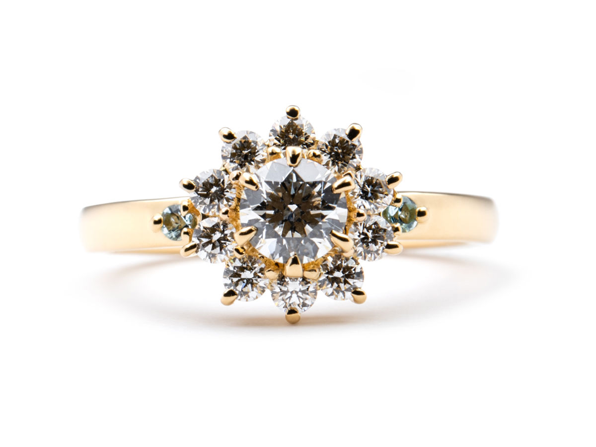 ひまわりの石座の左右には、アクアマリンとブルートパーズを留め、黄色の中に映える水色がとっても素敵です♡