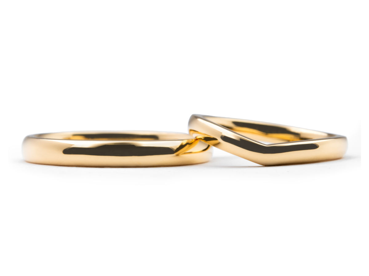 ご新郎様は丸みのあるストレートのデザインにし、ご新婦様は重ね付けした時のことを考えてV字の形状に!