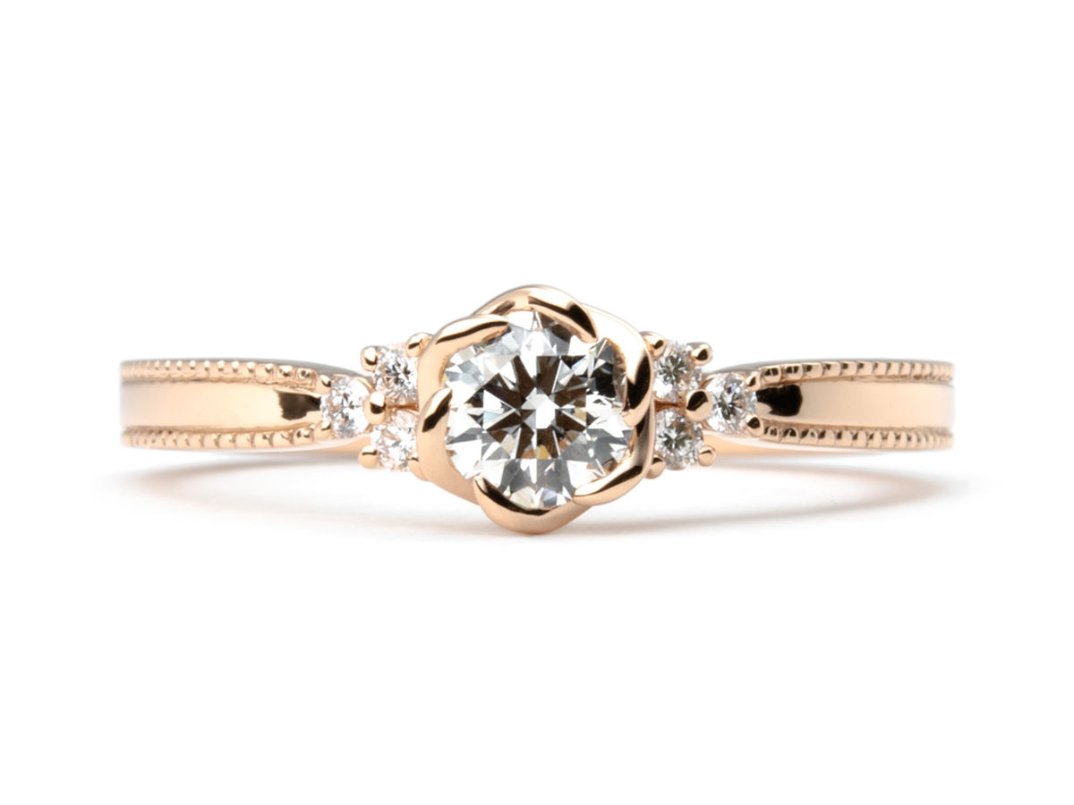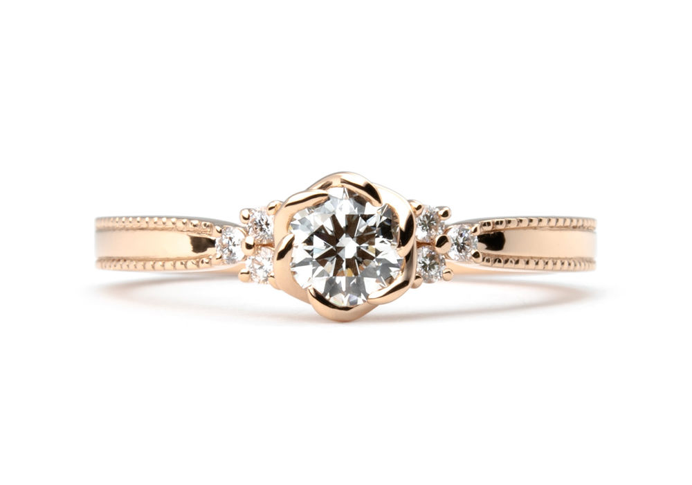 主役のダイヤモンドは花びらのように巻き込む爪で可愛らしく留められ、サイドに留まった小さなダイヤモンドも、花束のかすみ草のように華やかさを加えながらさりげなく主役のダイヤモンドを引き立ててくれています♡