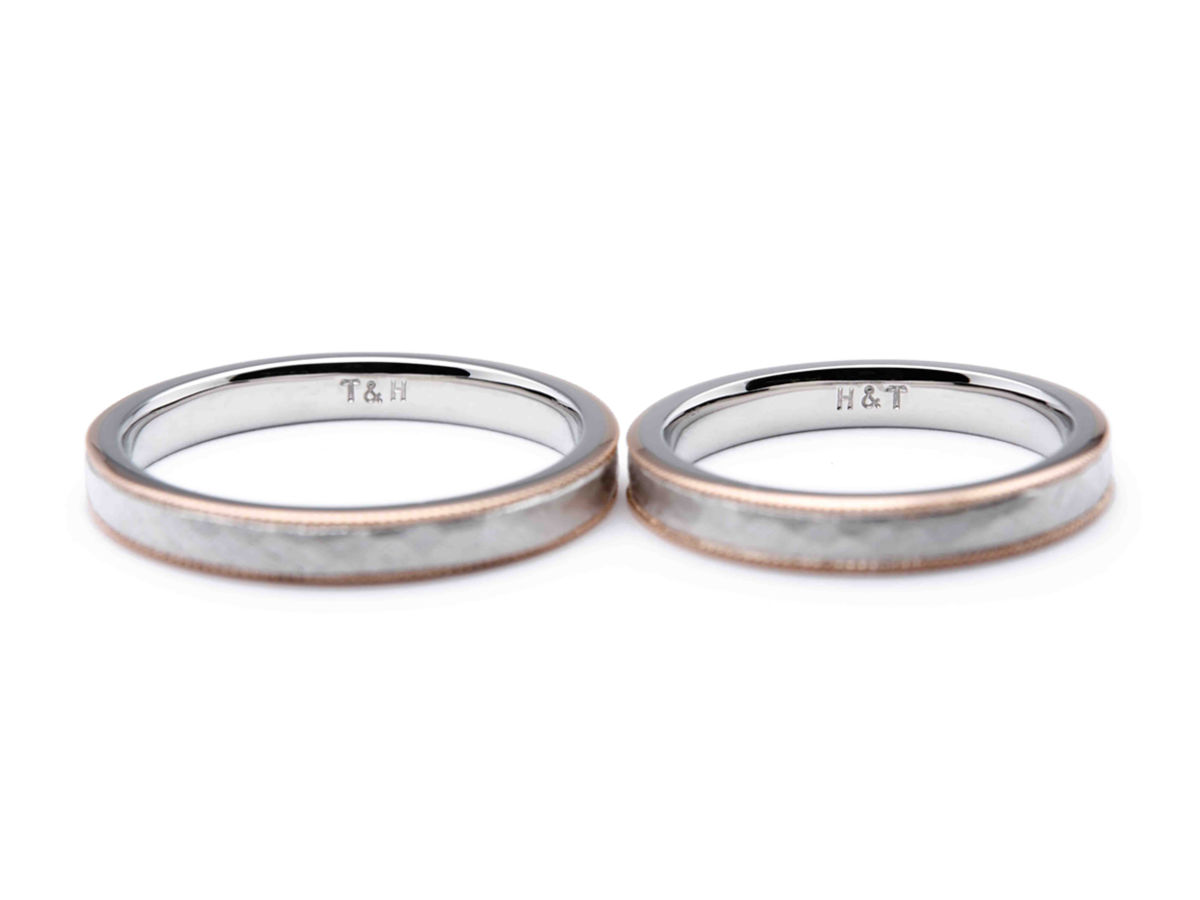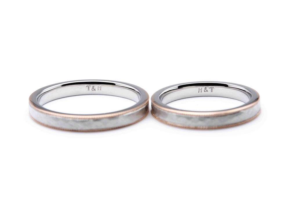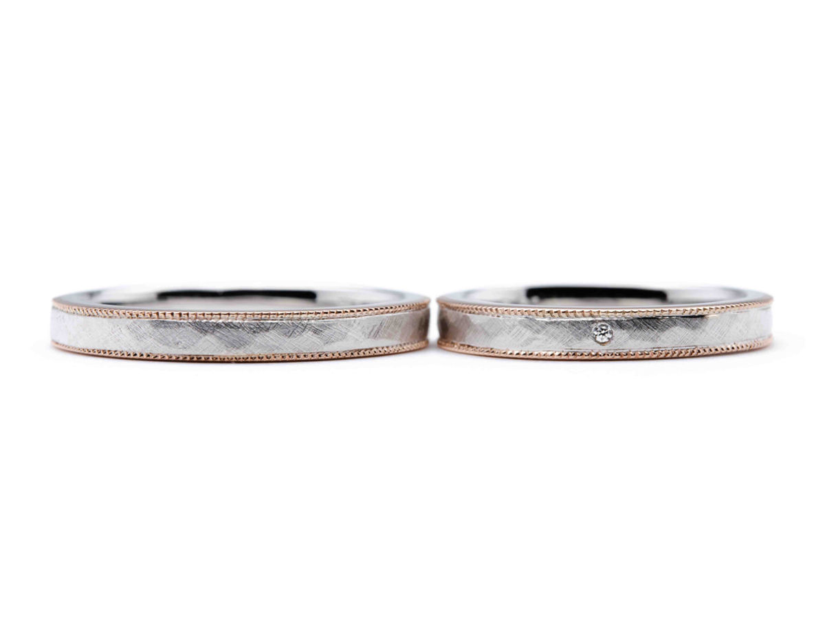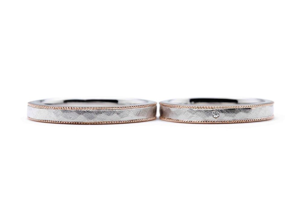 そちらに合わせて結婚指輪もピンクゴールドのミル打ち加工が入ったデザインをお選びいただいたのですが、こちらもおふたり一致のお好みのデザインとのことでスムーズにデザインをご決定いただきました!