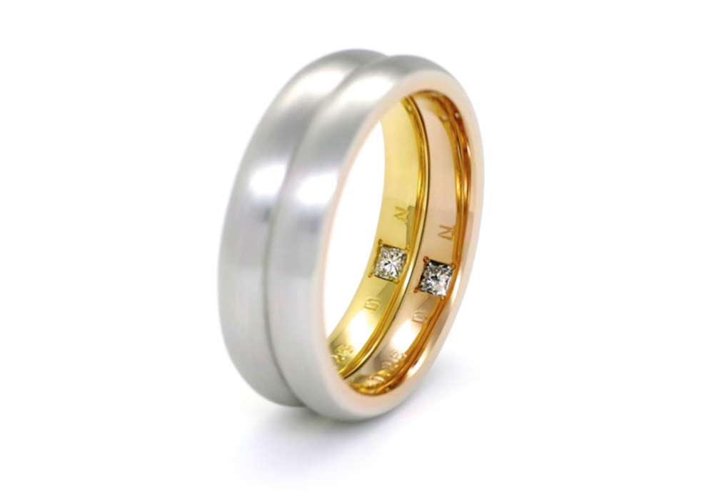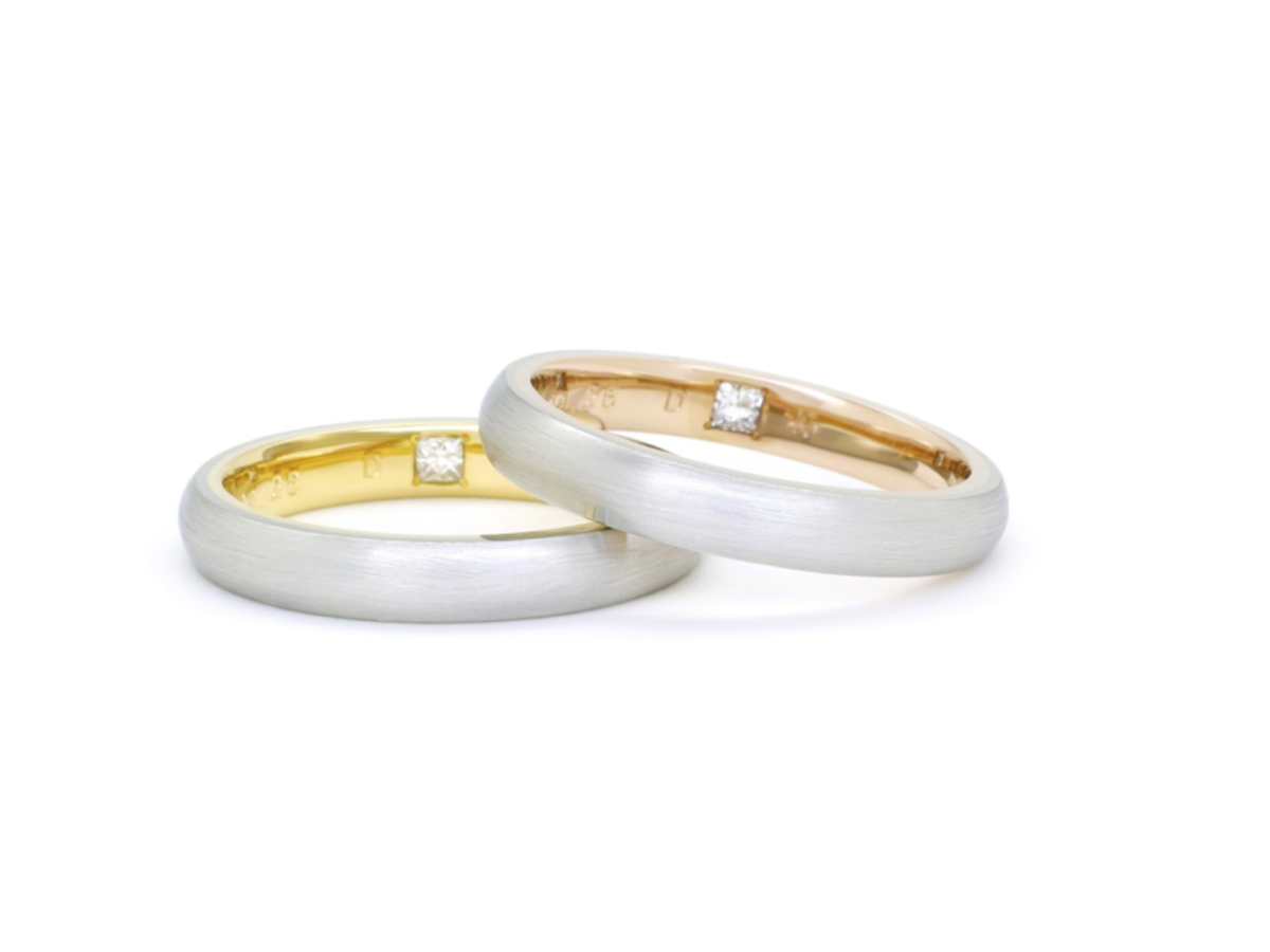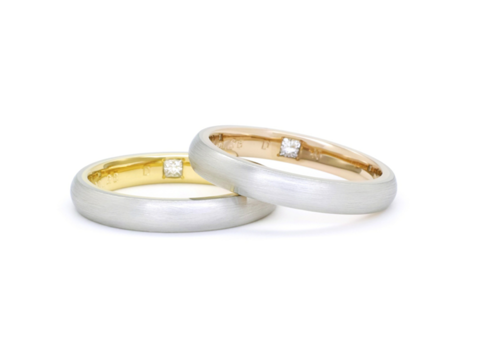 シンプルな甲丸の指輪につや消し加工を上品に施しました。内側はそれぞれお好みのゴールドで彩りました。