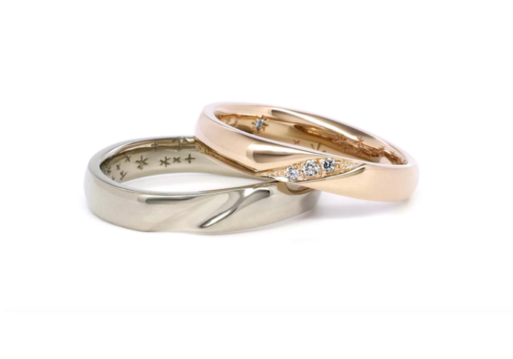 男性のリングと重ねてみると、内側にはキラキラと無数の星たちが天の川のように輝いています。その両側には織姫と彦星を模したブルーダイヤが負けない輝きを放っています。