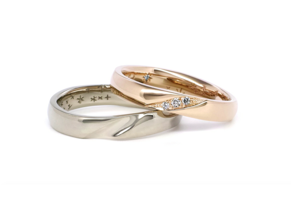 女性のリングには、ウェーブの溝に沿ってダイヤモンドが留まっています。