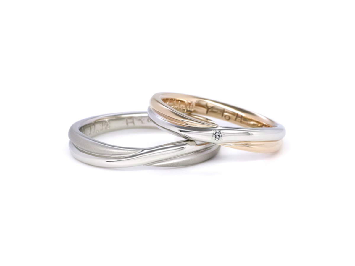 男性のリングはつや消しと鏡面を絡ませたデザイン、女性のリングはプラチナとピンクゴールドの組み合わせです。