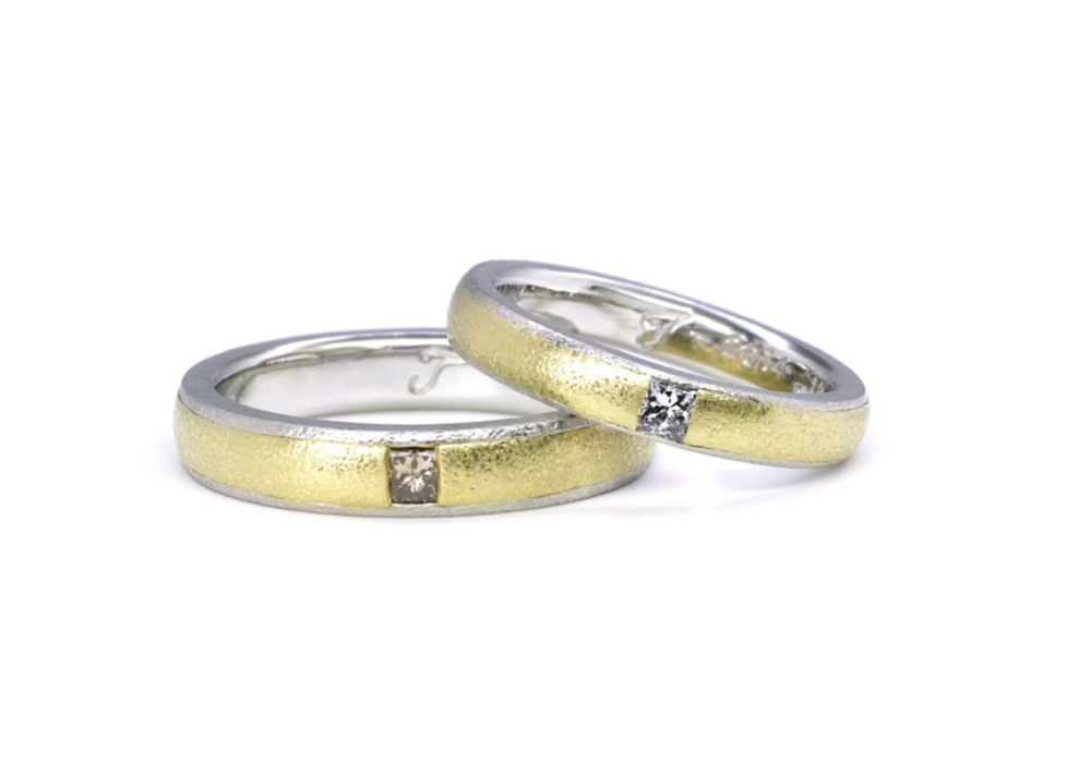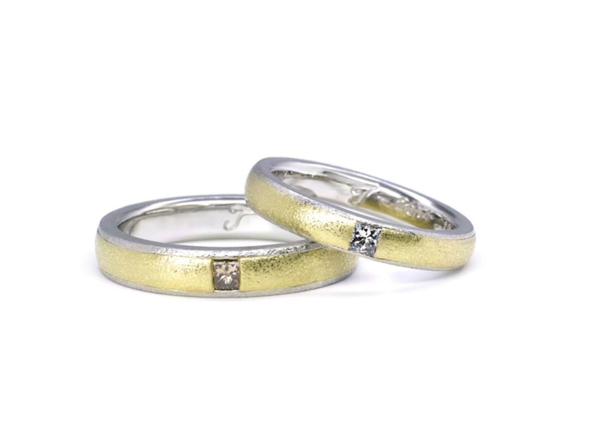 プラチナとイエローゴールドのコンビネーションに、色違いで入れたプリンセスカットダイヤがとても上品です。
