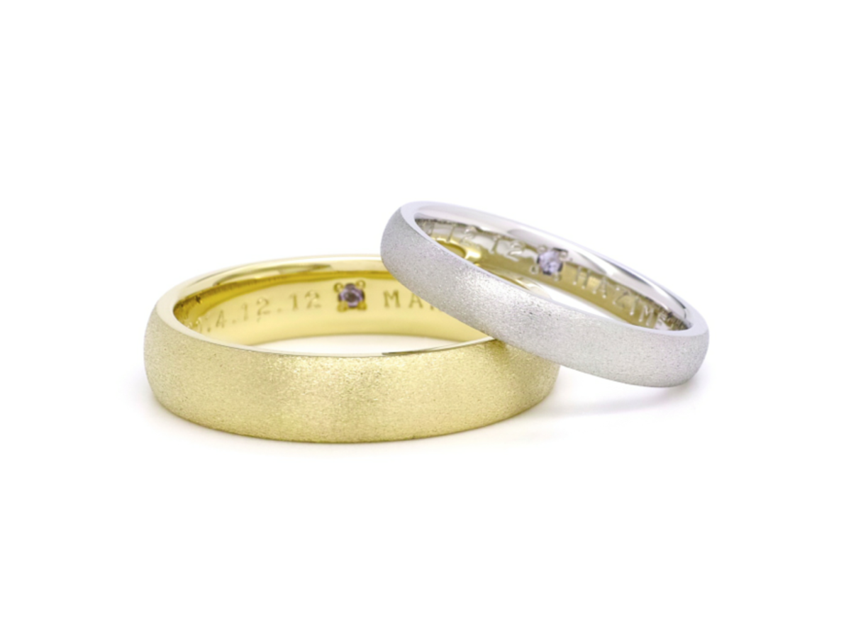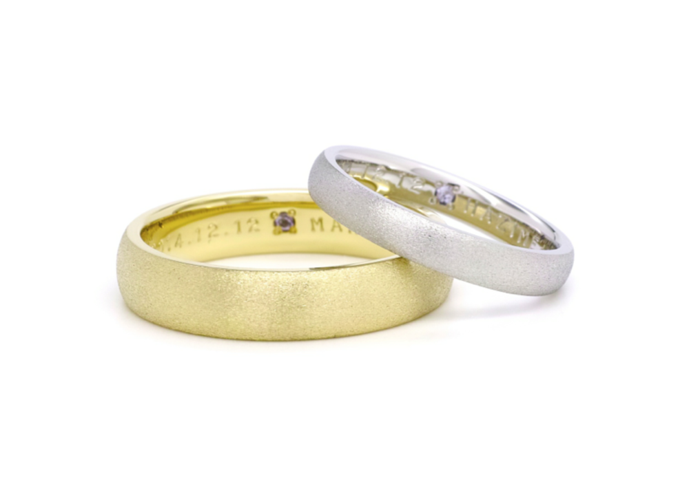 男性はイエローゴールドのボリューミーなリングで、女性はプラチナのスッキリとした甲丸の形をしています。