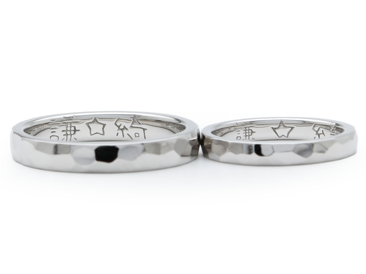 内側に手彫りの文字が刻まれた手作り結婚指輪(お客様作品)をご紹介致します。