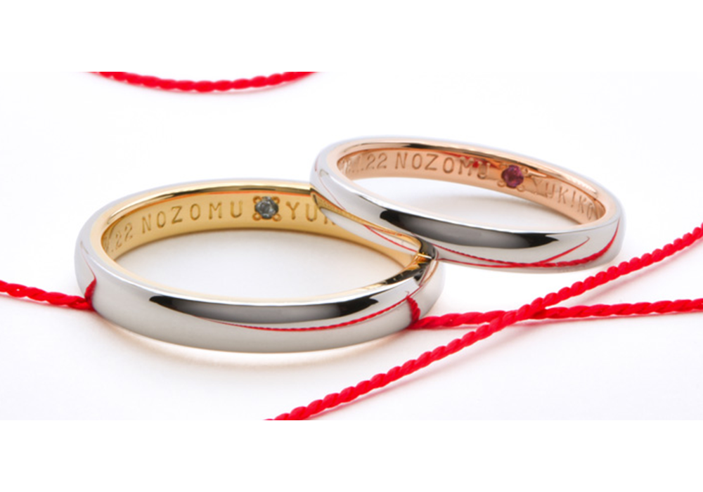内側と外側で金属の種類を変えるコンビネーション加工になっており、表面はプラチナ一色なので内側はお二人の秘密のカラーです。